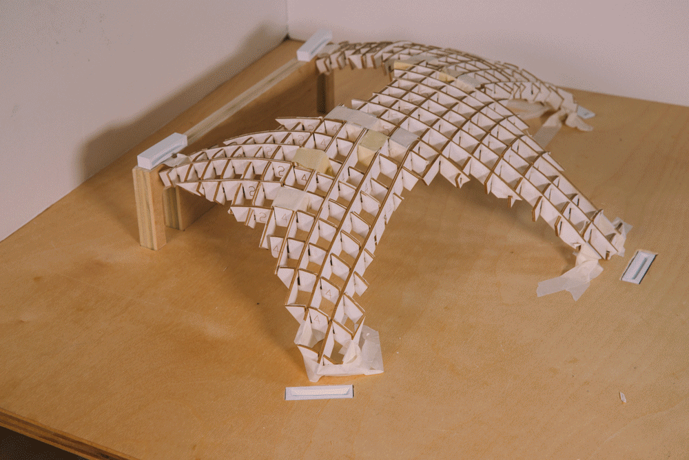 224 unique tiles make up the shell, numbered based on their corresponding edges. Each tile has positive and negative joints that slot in together without needing any mortar, adhesives or concrete. The compression only shell is self supported by its geometry, and by relying on its strength through computational geometry, the thickness of the shell can be reduced to 1/3 of what is normally needed to achieve that span. This means that less material is needed which aids in reducing the embodied carbon of the building.