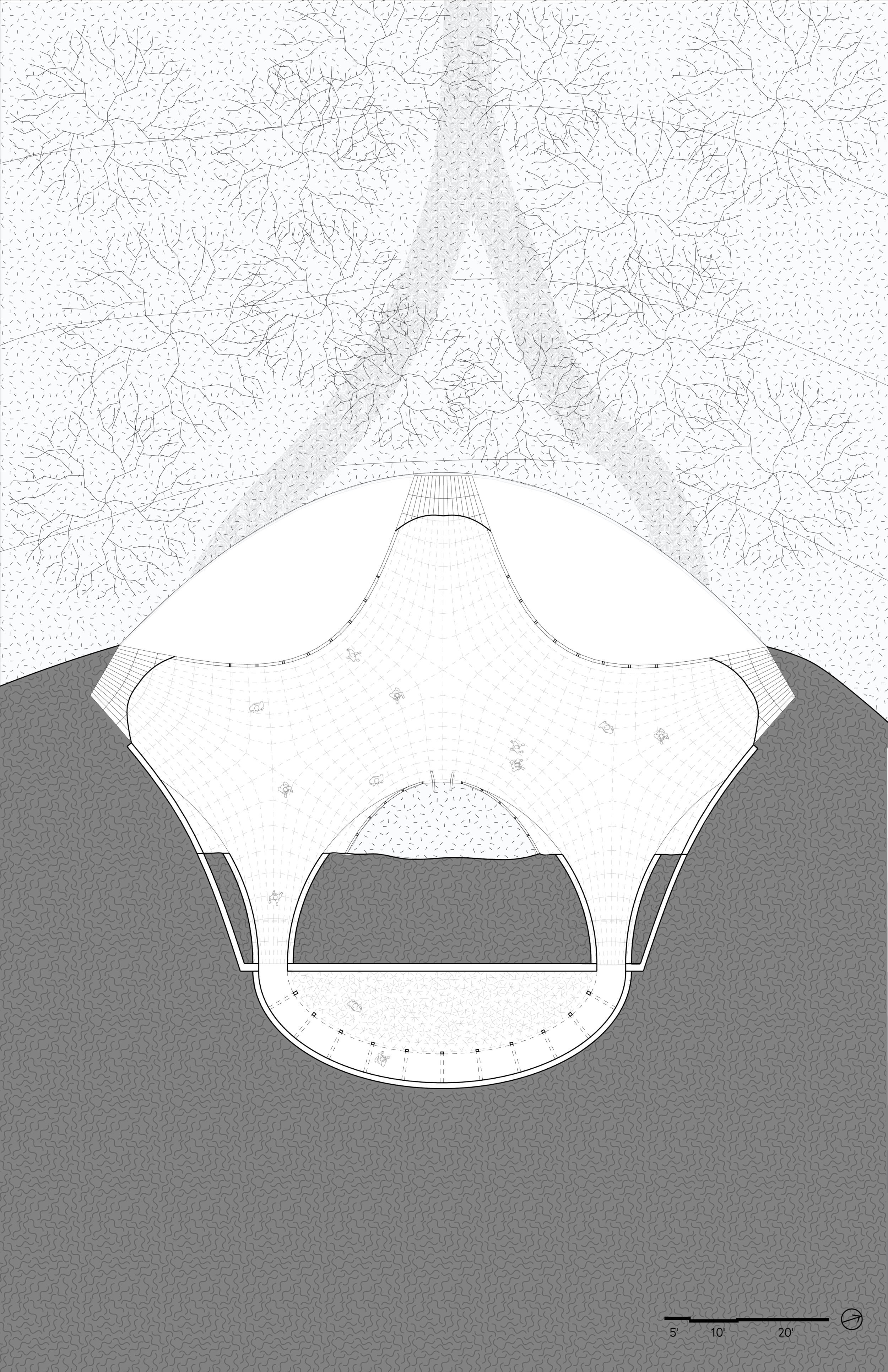 The open space is designed to be flexible to be used as a performative space, or to exhibit physical artifacts. From there a transitional space invites viewers to the underground to reveal the submerged space that is permanent exhibition of physical artifacts, the spaces become more intimate with slits from above.